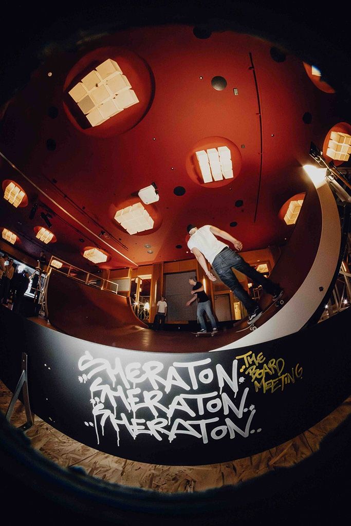Ett av de mest minnesvärda var The Board Meeting — en kväll som på ett perfekt sätt fångade andan i transformationen. Sheratons nyligen renoverade Ballroom byggdes om till en fullskalig halfpipe-uppvisning, som hyllade det lokalinvånarna kärleksfullt kallar ”Sheraton-åren”: det tidiga 1990-talets Stockholms skatescen, för vilken hotellets underjordiska garage fungerade som en central mötesplats för skateåkare och kreatörer. Evenemanget samlade skateåkare, fotografer och kulturröster för en uppvisning i halfpipe, en fotoutställning av Jens Anderssons bilder från eran och aldrig tidigare visat arkivmaterial på Ballroomens imponerande LED-skärm på 32 kvadratmeter. Med BASSBOSS-högtalare i rummet matchade ljudet tillfällets skala och energi fullt ut.